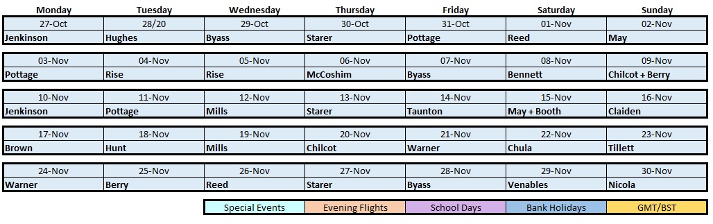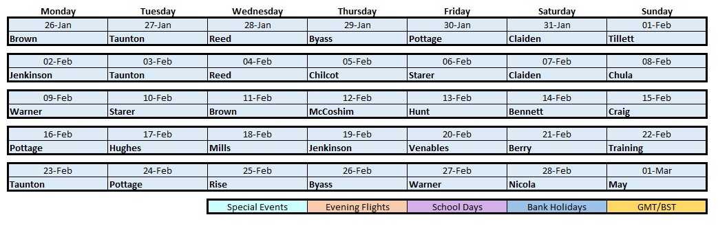 Winter weekends: One pilot to provide tug cover from the start of the day. Duty ends at lunchtime or with swap.